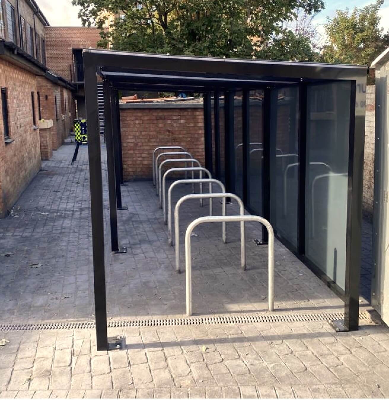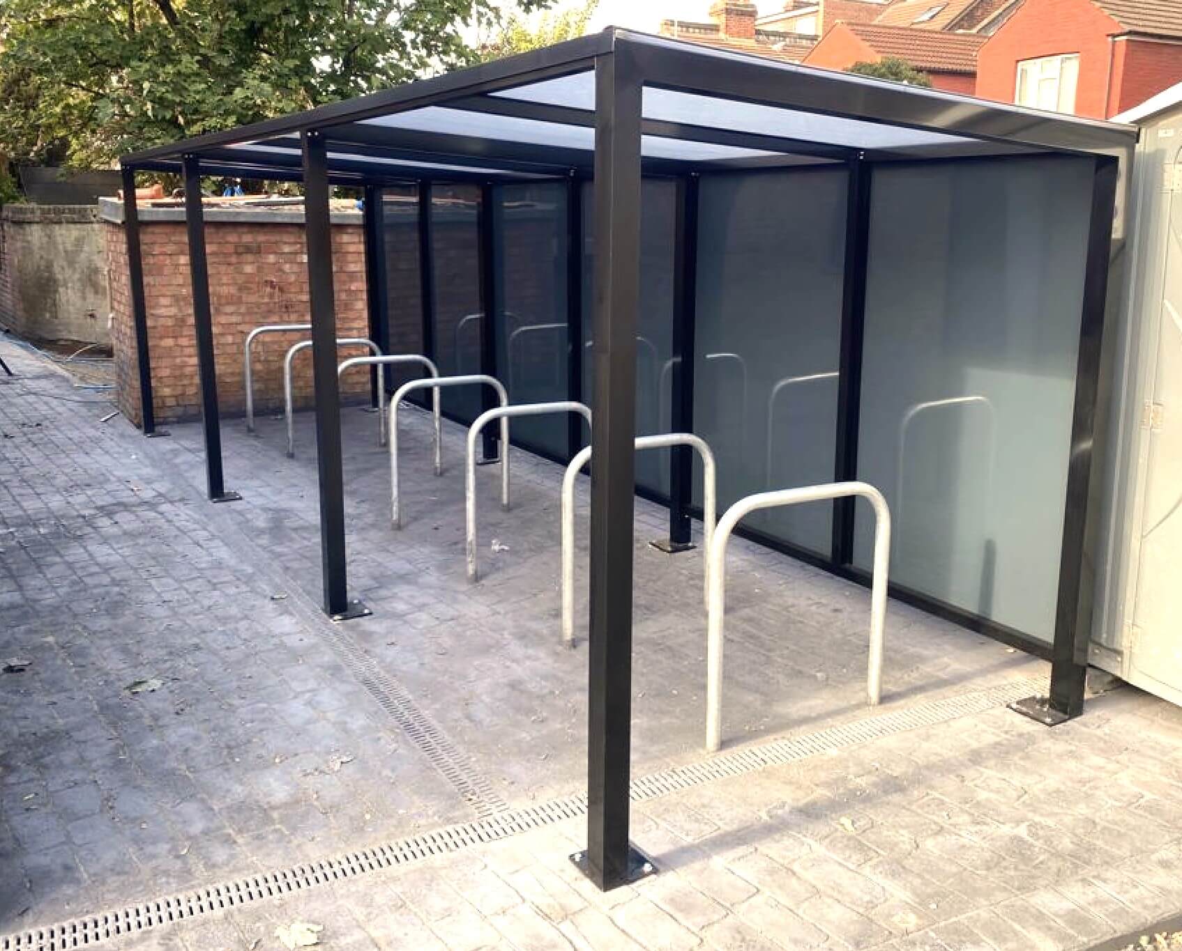 The Mono Pitch Cycle shelter is fabricated by hand from high-quality, high-grade aluminium extrusions. The framework of the shelter will be powder coated to your chosen RAL colour. This process will prevent any corrosion in the future and make the shelter very low maintenance. The glazing panels of the shelter will consist of solid polycarbonate sheeting that is available in several colours. The structure can be either base plate fixed to a suitable hardstanding or submerged below ground within a concrete pocket and top finished to match. Sheffield cycle hoops will also be installed within the shelter for cyclists to lock their bikes too with there own lock.